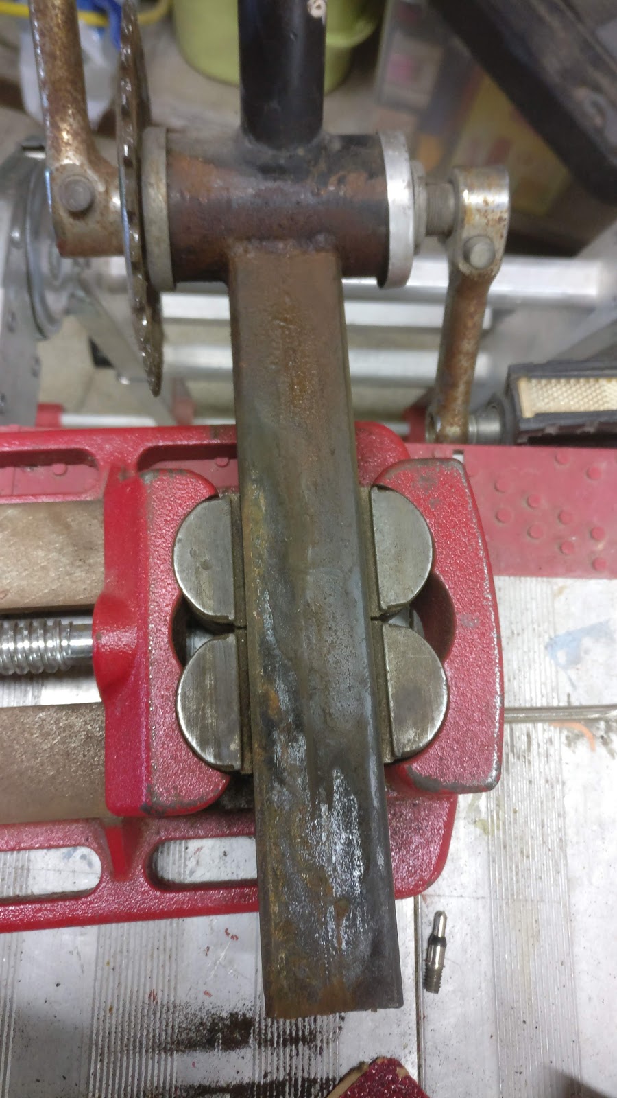 Op zicht viel het nog mee. In hoofdzaak is het frame zo goed als mogelijk behandelen tegen roest en 1 binnen band vervangen. De binnenband hebben we meteen aan begonnen. Daarna hebben we met veel moeite ook de boom vooraan uit elkaar gekregen want deze was volledig aan elkaar geroest maar met wat WD40 en tikken met de hamer is deze toch uit elkaar geraakt.